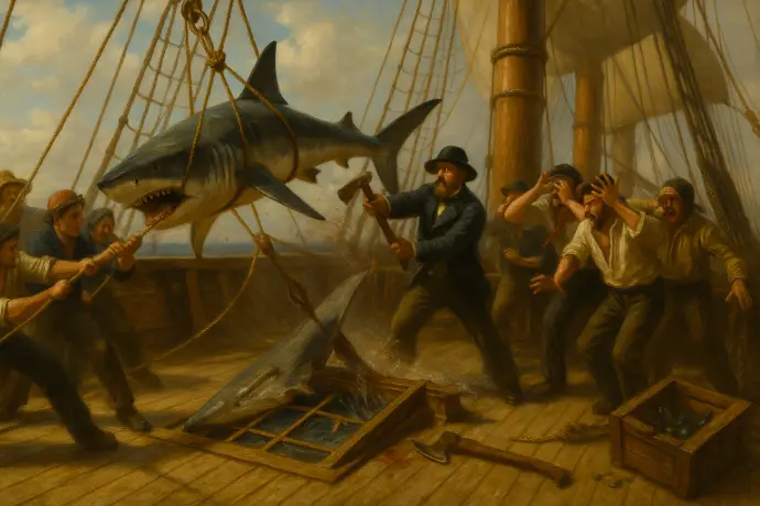 Saw several pilot fish about. They are the fish that always attend the shark. We bathed although the Captain said most likely there was a shark about. We had been swimming just a little ahead of the vessel as it was quite calm but kept close hold of a rope and had a man on the yard to look out for sharks - five of us were in the water. We ad not all been dressed more than a quarter of an hour when a large shark came from under the vessel's bottom, where I have not the slightest doubt he had been all the time we were bathing. The shark hook had been baited this morning with a piece of pork and as soon as he saw it he just swum around it once, rolled over snd took it into his gills - the Captain paid out the line to give him time to swallow it - and then twelve of us, the men and passengers, hailed on it. It took all twelve to haul him up on the side. A sailor then passed a bowline over his tail, made it fast to a luff tackle and then hauled him on board. As soon as he was over the bulwarks there was a general rush out of the way. He smashed the skylight all to shivers with his tail. He could have broken a man's leg without the least exertion. One of the men then cut his tail off with a cut fro an axe. We then stabbed him to death. I asked for the head and got it. I then skinned it, cut out the jaws and had the cook boil them as the Captain said that was the best way to take the flesh off. However the cook boiled them too much which spoiled them as they become almost jelly, but I have kept the teeth, one fin and the skin which I took off the head. I will send one of the teeth and a piece of the skin home to you when I get to Natal.