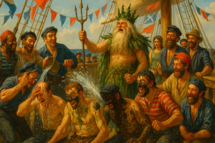 The ritual performed on sailing ships when crossing the equator is known as "crossing the line" ceremony. This tradition dates back several centuries and was especially popular among sailors in the British Royal Navy and merchant ships. > > During the ceremony, sailors who had never crossed the equator before were often called "Pollywogs." Those who had previously crossed were referred to as "Shellbacks." As the ship approached the equator, a festive celebration would be organized to mark the occasion. > > Typically, the ritual involved a series of humorous and often elaborate trials. Participants might be doused with water, covered in grease or paint, and subjected to good-natured hazing. They would perform various acts before a figure representing King Neptune, the Roman god of the sea, and his entourage. > > Once the initiation rites were completed, the Pollywogs were officially "transformed" into Shellbacks. They would often receive a certificate or some form of recognition to commemorate their crossing. This ceremony not only served to bond the crew but also to create a sense of tradition and camaraderie among sailors.