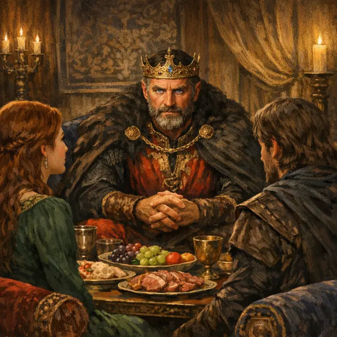 He ushered Tanith and Michael into a small adjoining chamber where a meal was laid out. The servants were swept out and the door closed in a moment. They all washed their hands in the large bowls of warm water. The King piled cold meats and fruit on platters and handed food to them, deep in thought. When they were seated on velvet couches he turned to them and fixed his gimlet blue eyes on them.